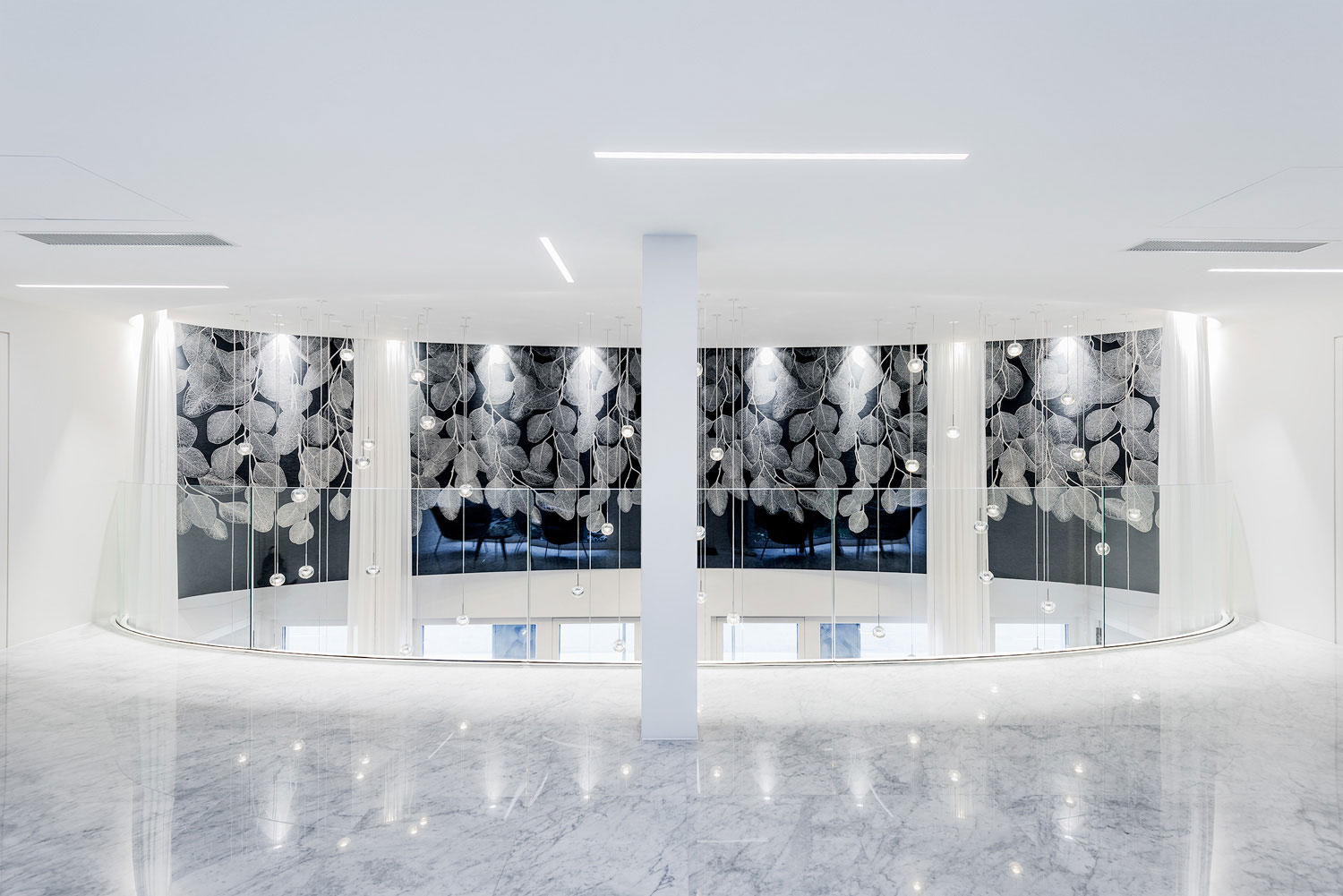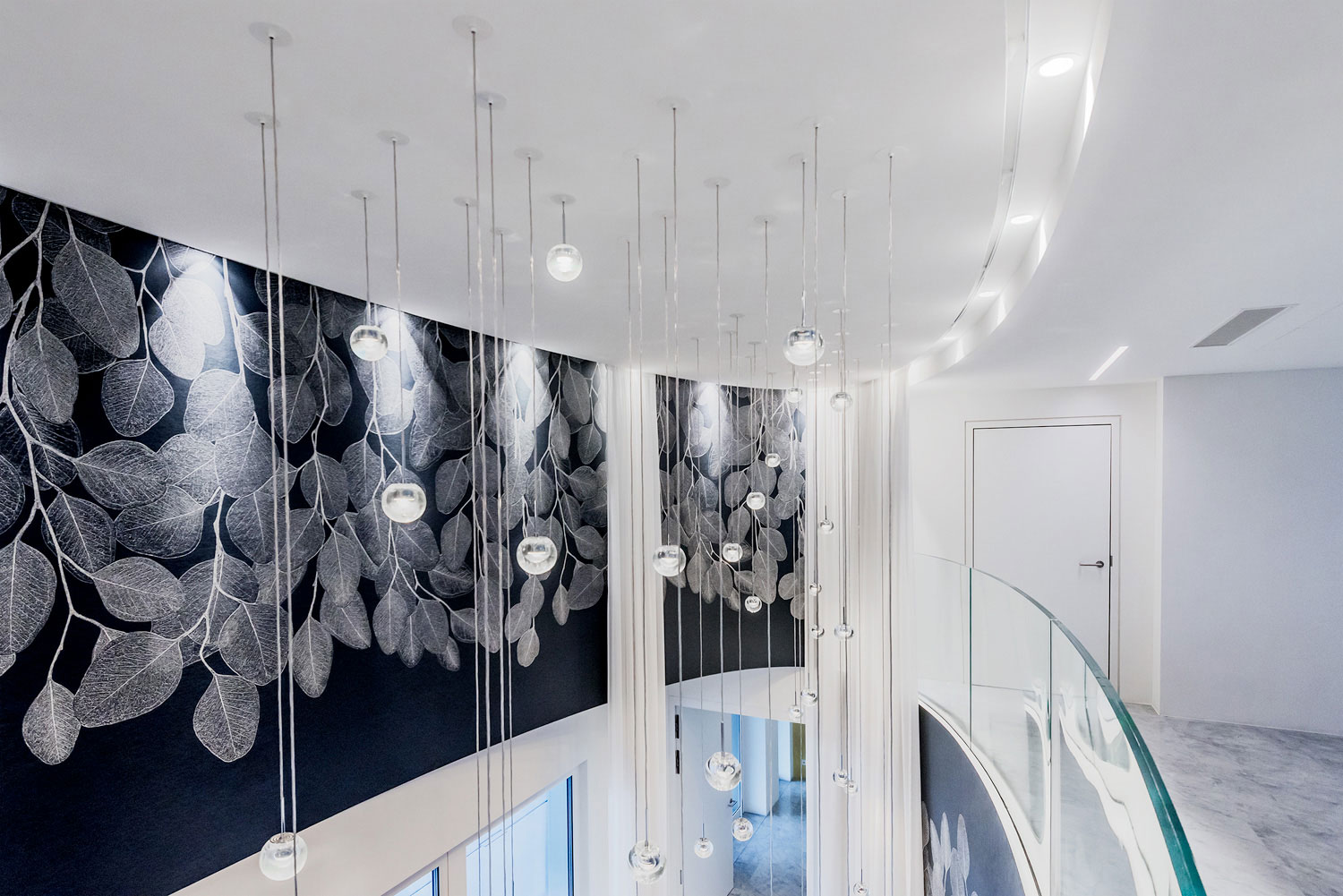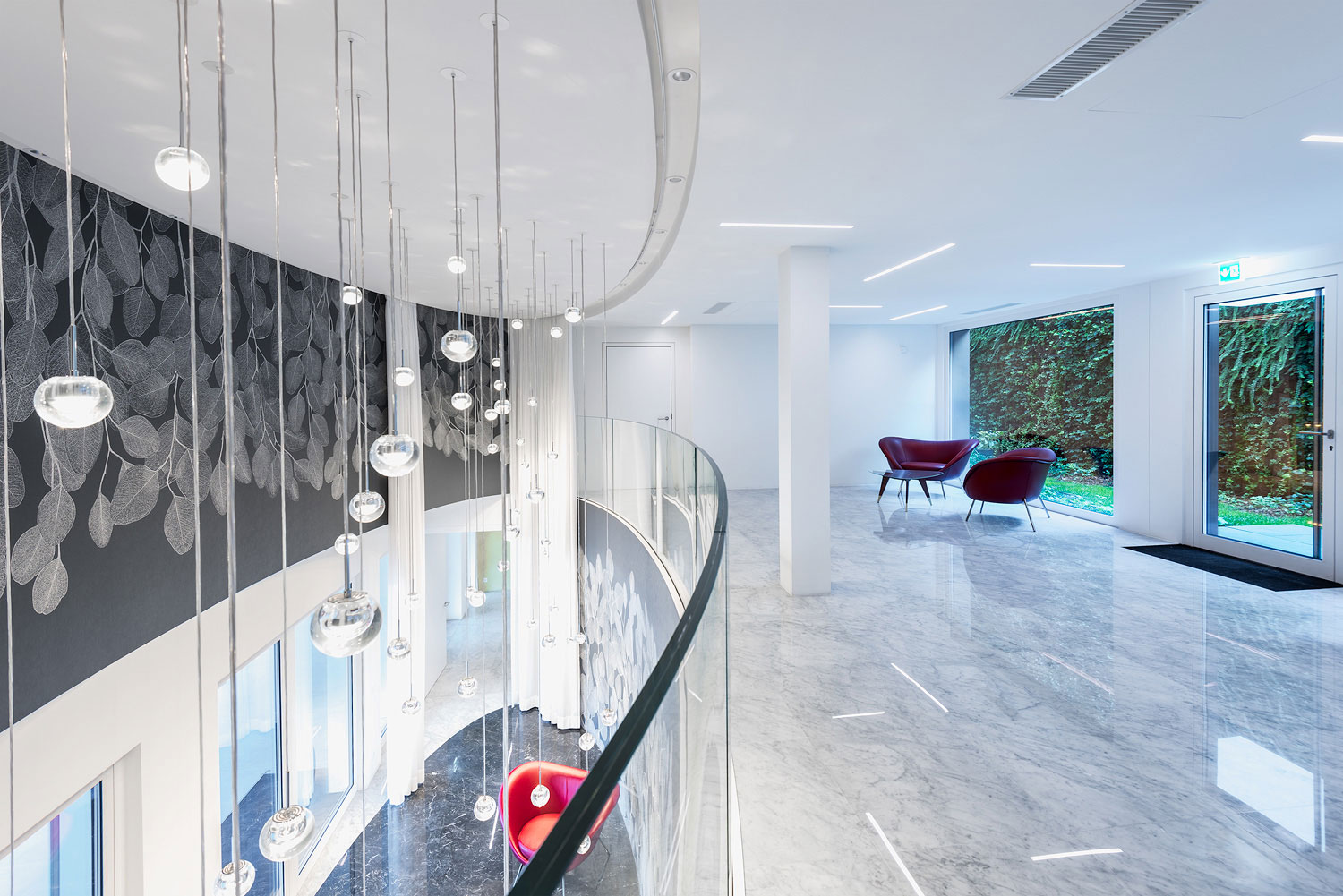 Tra gli ambienti interni oggetto di intervento illuminotecnico, particolare considerazione merita l’atrio d’ingresso che, in parte riprende il motivo luminoso delle linee random riscontrabile nel portico esterno e, dall’altra, sorprende e accoglie i residenti e visitatori con un sapiente gioco di luci e riflessioni reso possibile dall’installazione luminosa presente al suo interno.