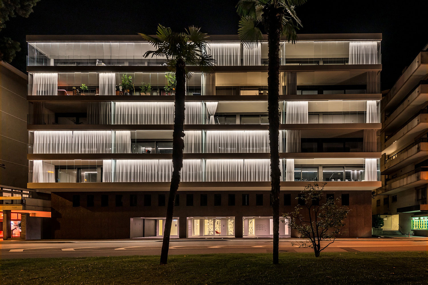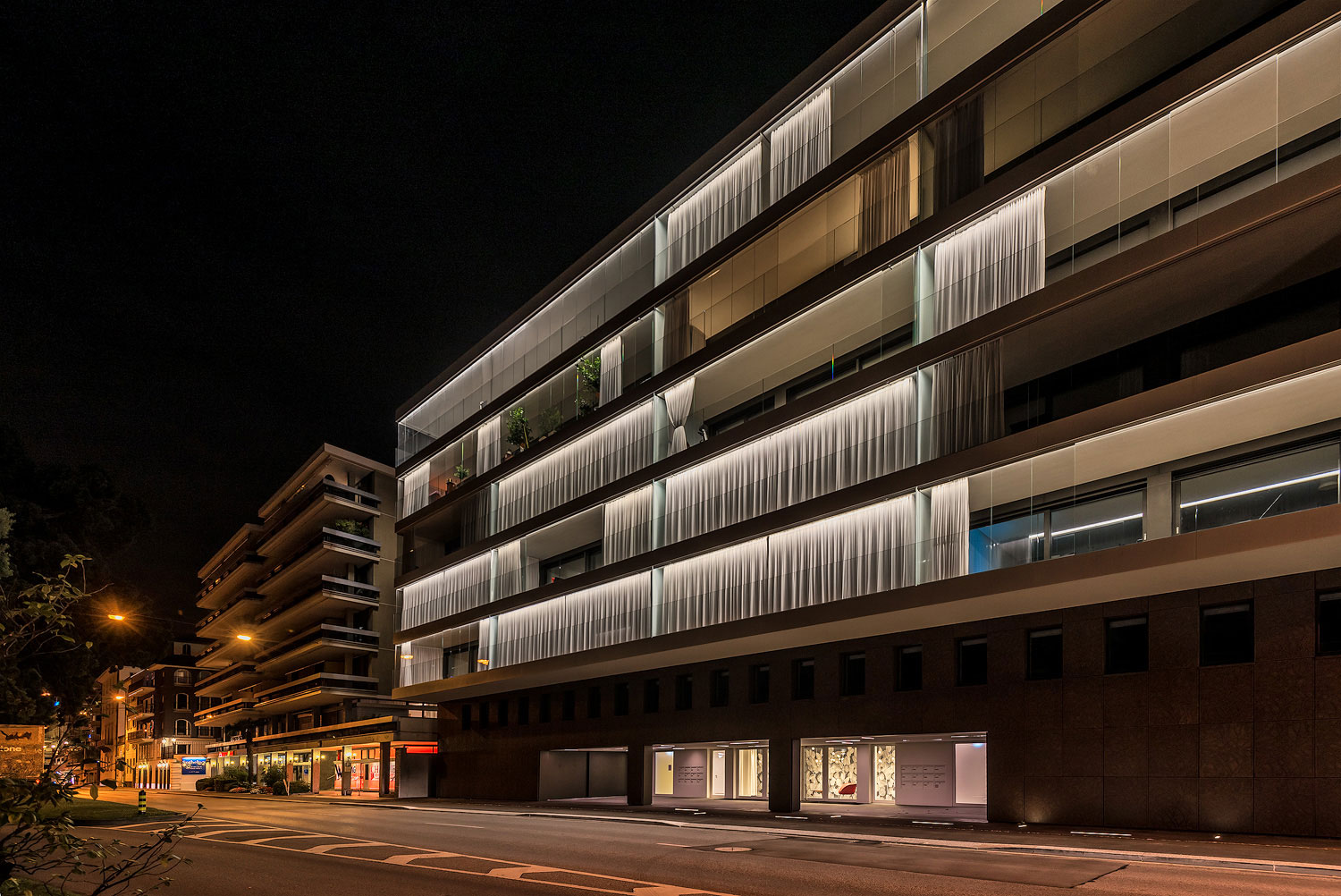 L’edificio Riva Caccia, si presenta come una struttura moderna e dinamica che si affaccia sul Lungolago di Lugano in tutta la sua eleganza. Di notte, per poterne preservare il carattere, è stata studiata un’illuminazione che rispettasse la linearità ricorrente nella sua architettura e conferisse un’immagine complementare a quella visibile di giorno. Ne è stata curata la facciata principale in maniera tale da attribuire una certa armonia e coerenza nell’illuminazione dei balconi, lasciando la possibilità di personalizzarli con lampade decorative a piacimento.