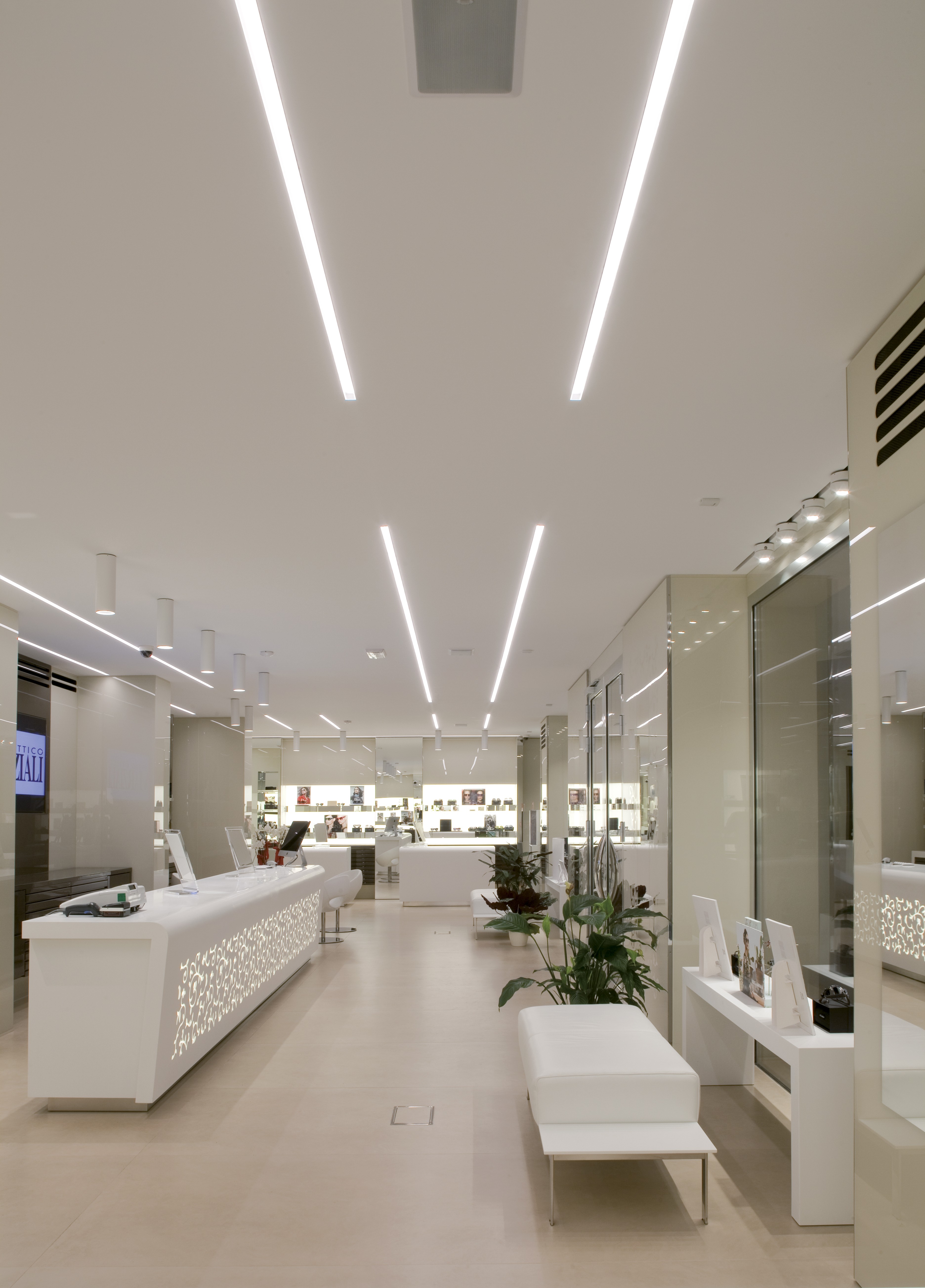 È stato quindi studiato un sistema illuminotecnico che valorizzasse la struttura architettonica del negozio e il design moderno degli arredi, attraverso una luce che si integrasse bene nello spazio. La sorgente luminosa è ben nascosta e l’attenzione viene catalizzata sul negozio stesso e sulla merce oggetto di vendita, veri protagonisti della scena.