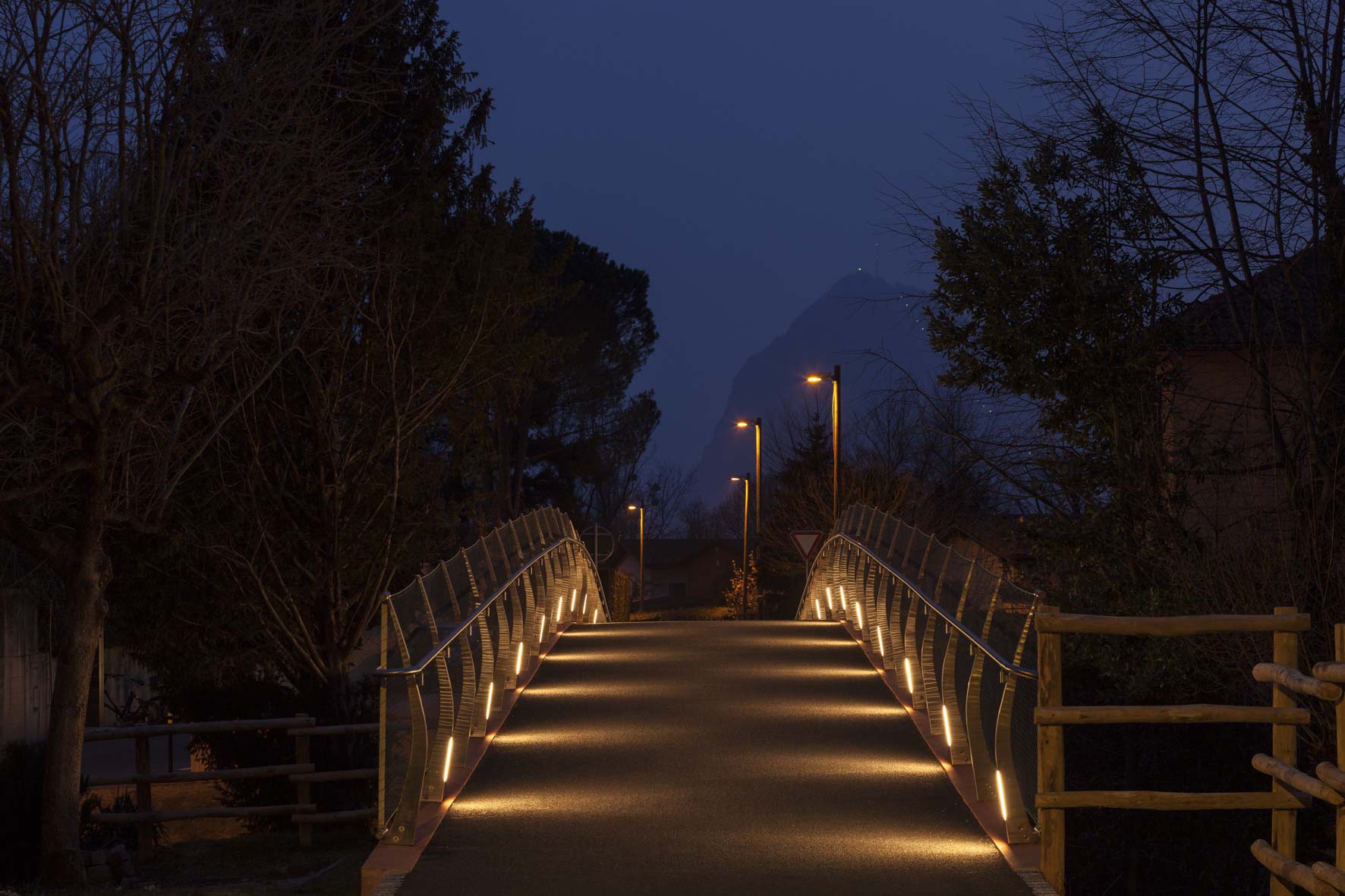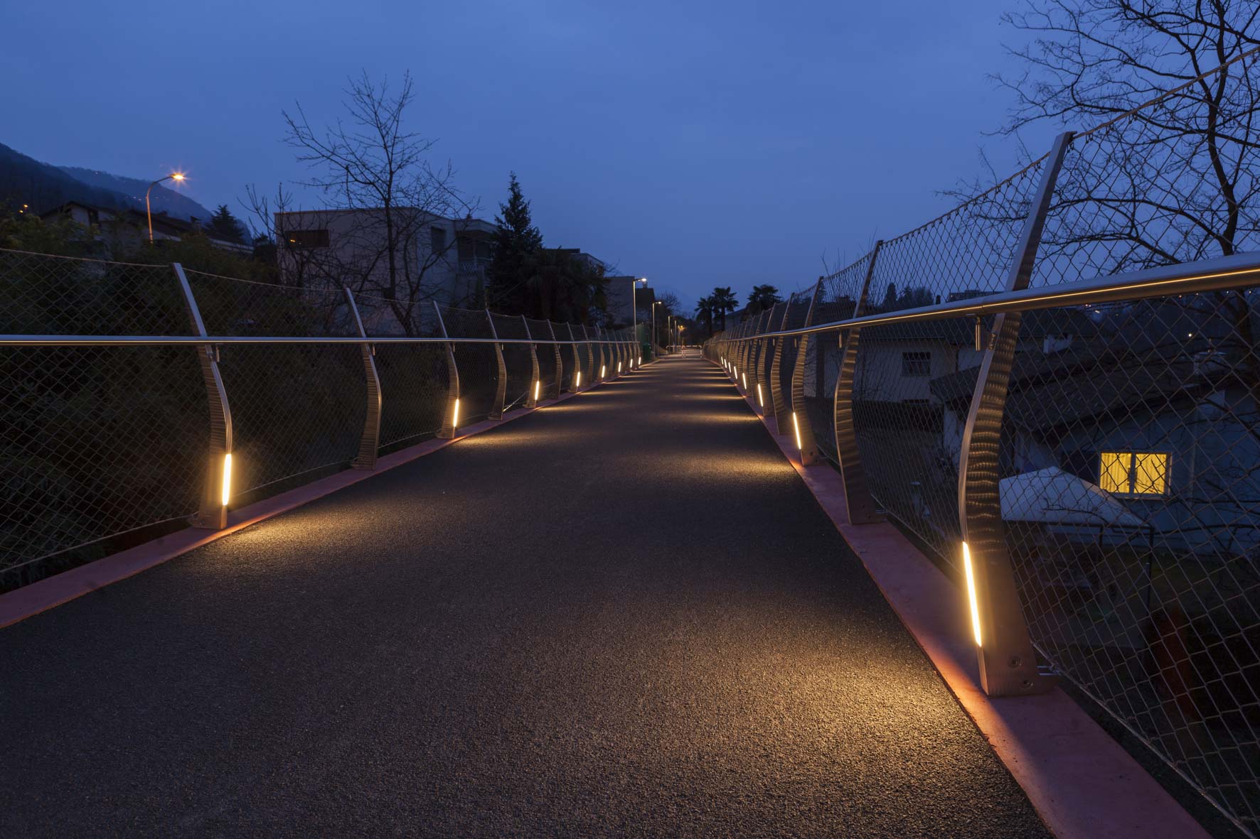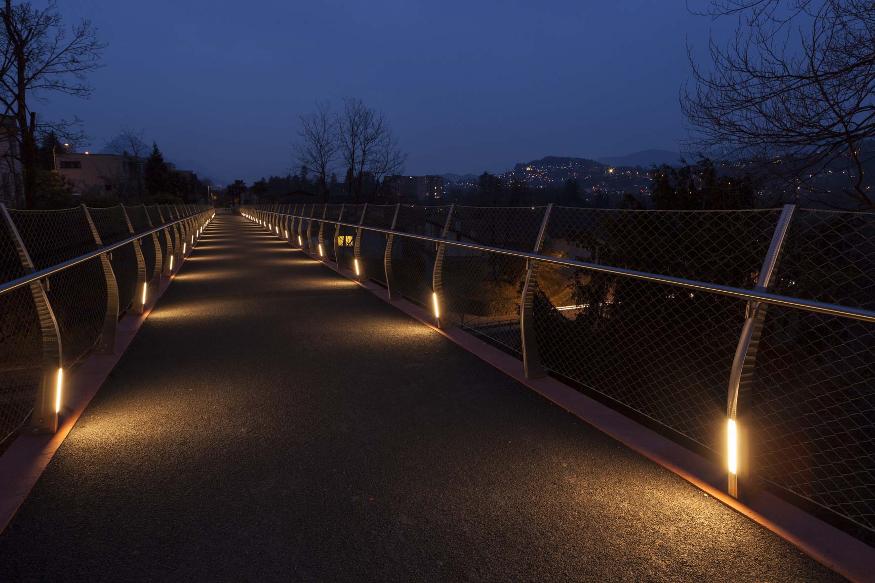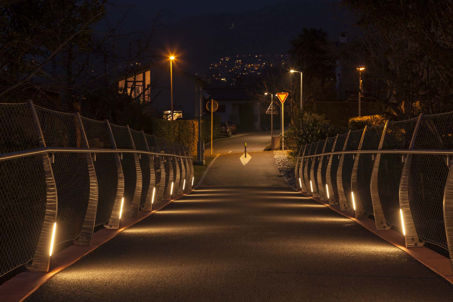 La luce, calda e controllata, è distribuita da ottiche asimmetriche che evitano abbagliamenti e dispersioni, valorizzando l’architettura e rispettando l’ambiente circostante. Il risultato è una presenza notturna misurata e coerente, in grado di guidare l’attraversamento con precisione ed eleganza.