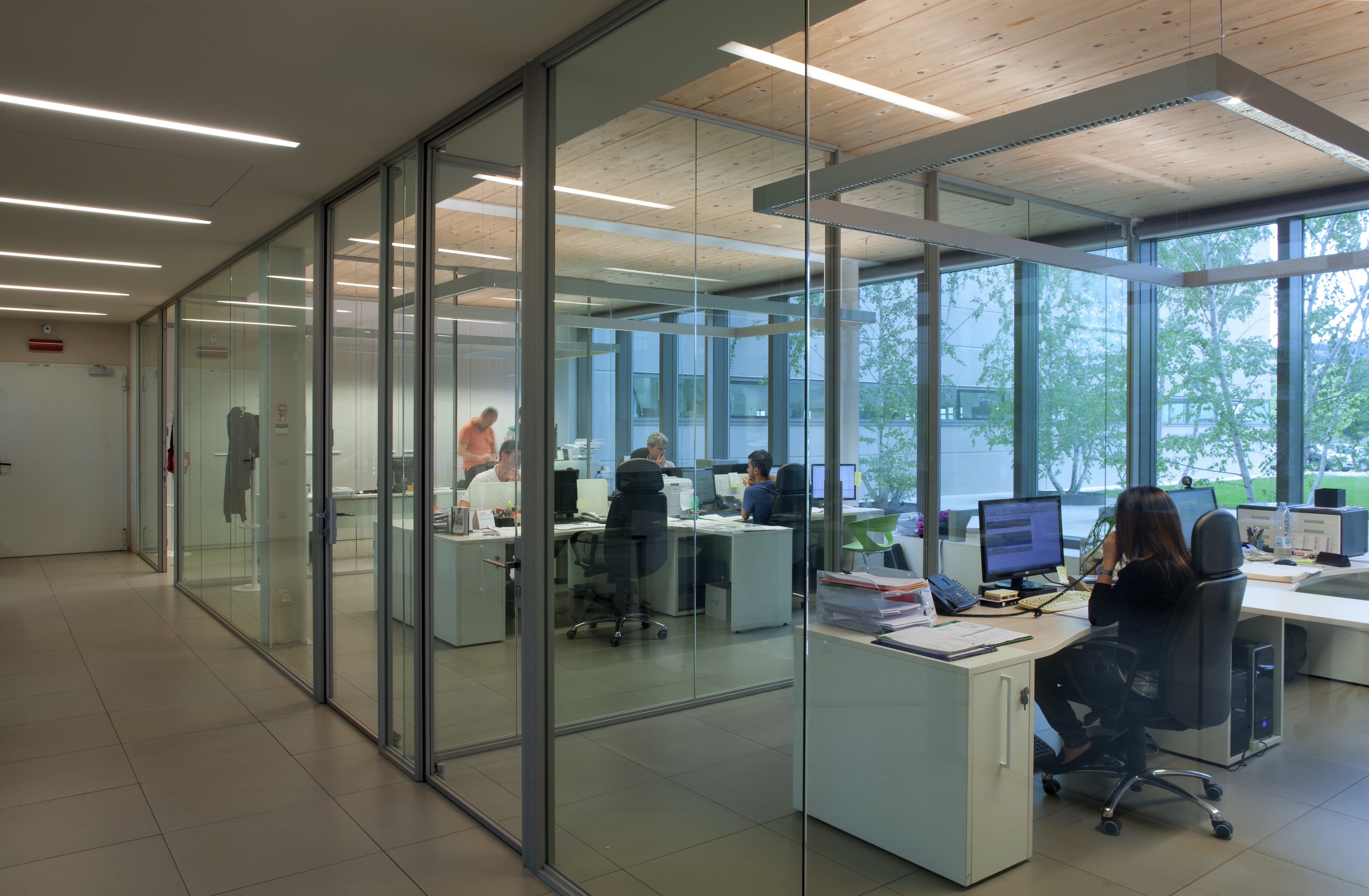 La struttura in legno del soffitto, la presenza di videoterminali che causano riflessioni e la quantità di luce naturale che proviene dalle vetrate hanno influenzato le decisioni in termini di illuminazione e hanno richiesto la progettazione di apparecchi illuminanti su misura in grado di superare i vincoli e soddisfare i requisiti in termini di sostenibilità e livelli di illuminamento.